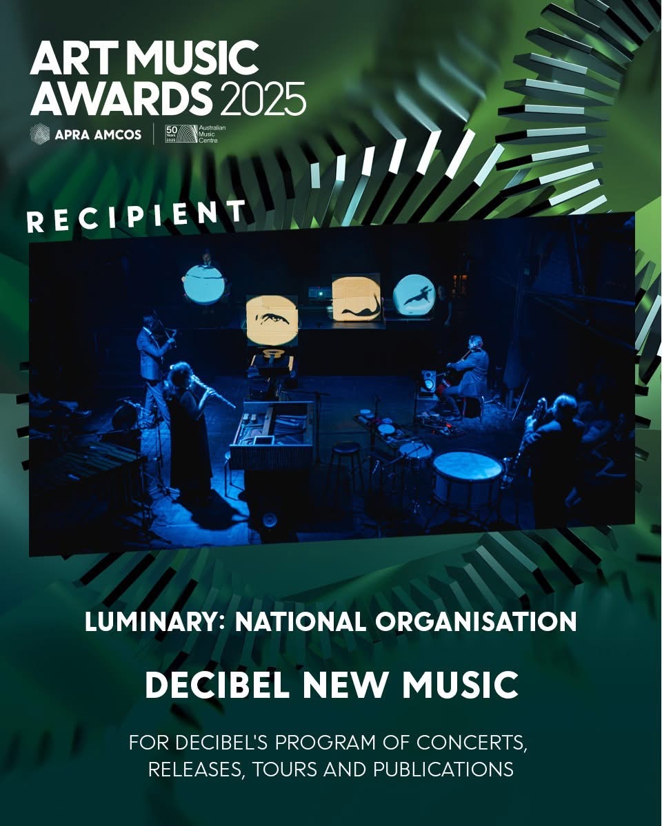 Decibel has been awarded the 2025 Luminary: National Organisation award at the Art Music Awards, recognising our programming of concerts, releases, touring and publications.